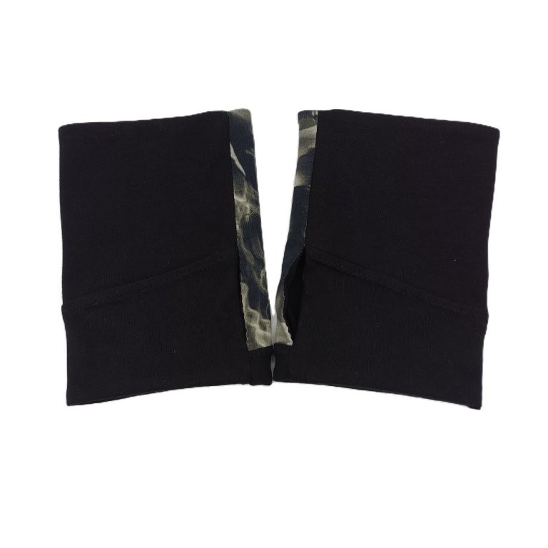 Diese Handstulpen / Pulswärmer mit Daumenloch wurden aus gemustertem Stoff mit Totenköpfen und Flammen und schwarzem Uni-Stoff genäht. Innen sind die Pulswärmer schlicht schwarz.