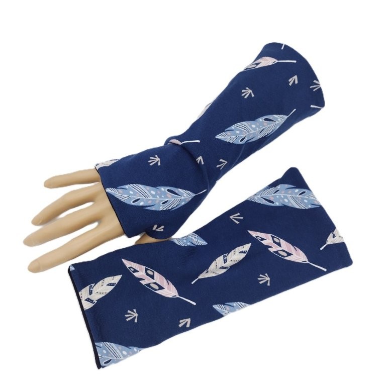 Bei diesen Armstulpen wurde blauer Muster-Jersey mit pastellfarbenen Federn kombiniert mit weichem, uni blauem Jersey im Inneren.