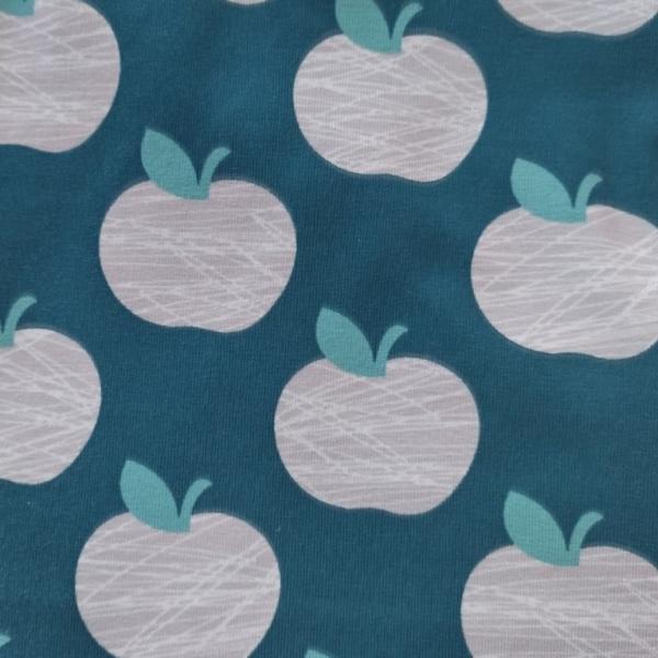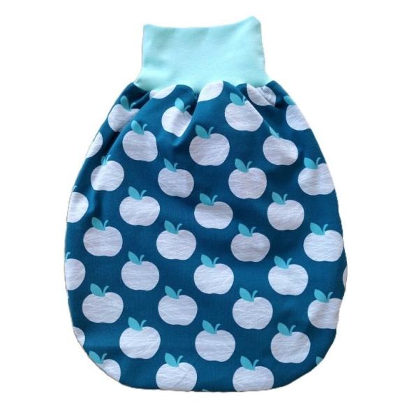Für diesen Strampelsack wurde außen petrolfarbener Jersey mit grau-weiß gemusterten Äpfeln vernäht. Gefüttert ist er mit uni mintgrünem Jersey. Der Farbton des Futterstoffes entspricht dem des Bündchens.