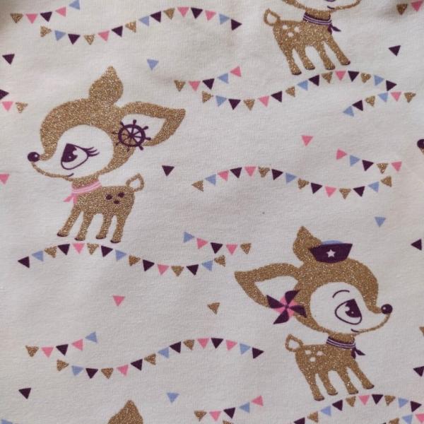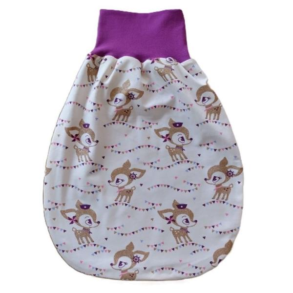 Für diesen Strampelsack wurde außen cremefarbener Jersey mit glitzernden Rehkitzen und bunten Wimpeln vernäht (Eigenproduktion von Alles für Selbermacher, Design von Nikiko). Gefüttert ist er mit uni beerefarbenem Jersey. Der Farbton des Futterstoffes entspricht dem des Bündchens.