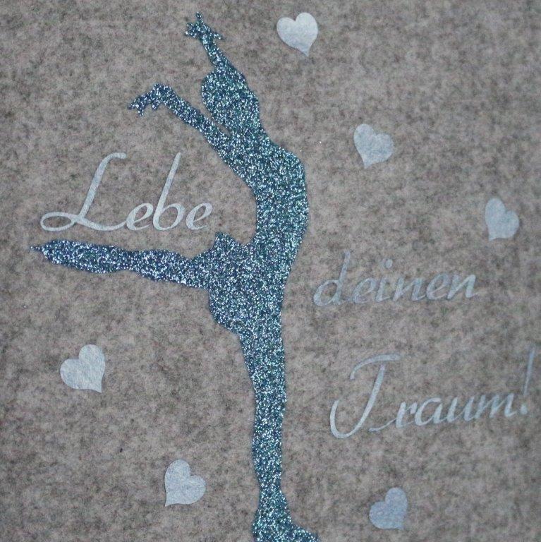Hellgrau melierter Organizer aus Filz mit Eiskunstlauf-Motiv in hellblau und blau Glitzer bedruckt.