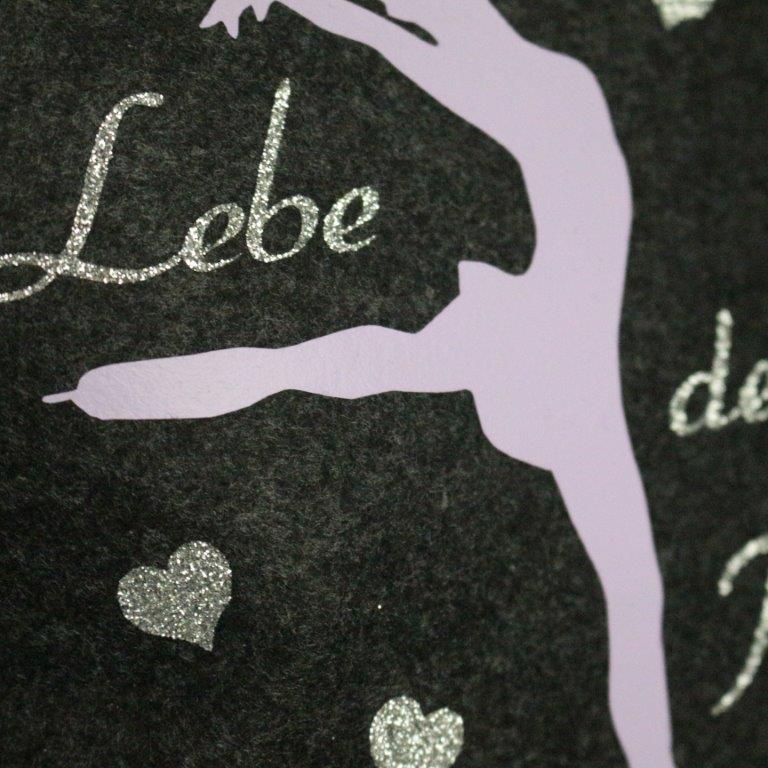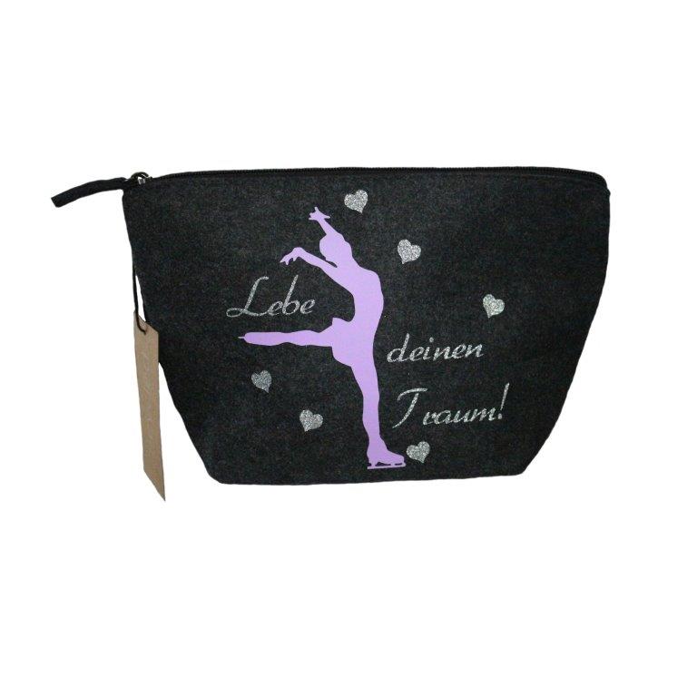 Grau melierter Organizer aus Filz mit Eiskunstlauf-Motiv in flieder und silber Glitzer bedruckt.