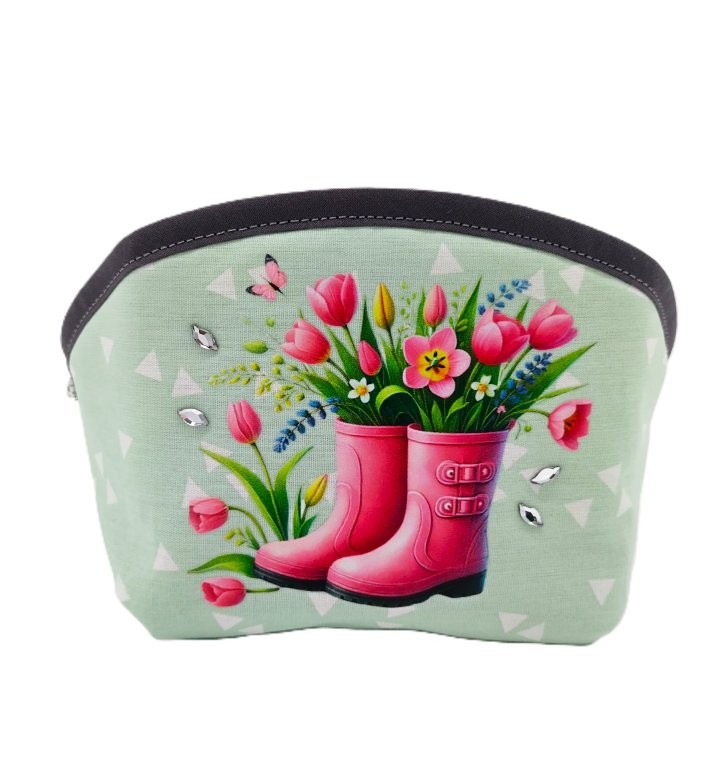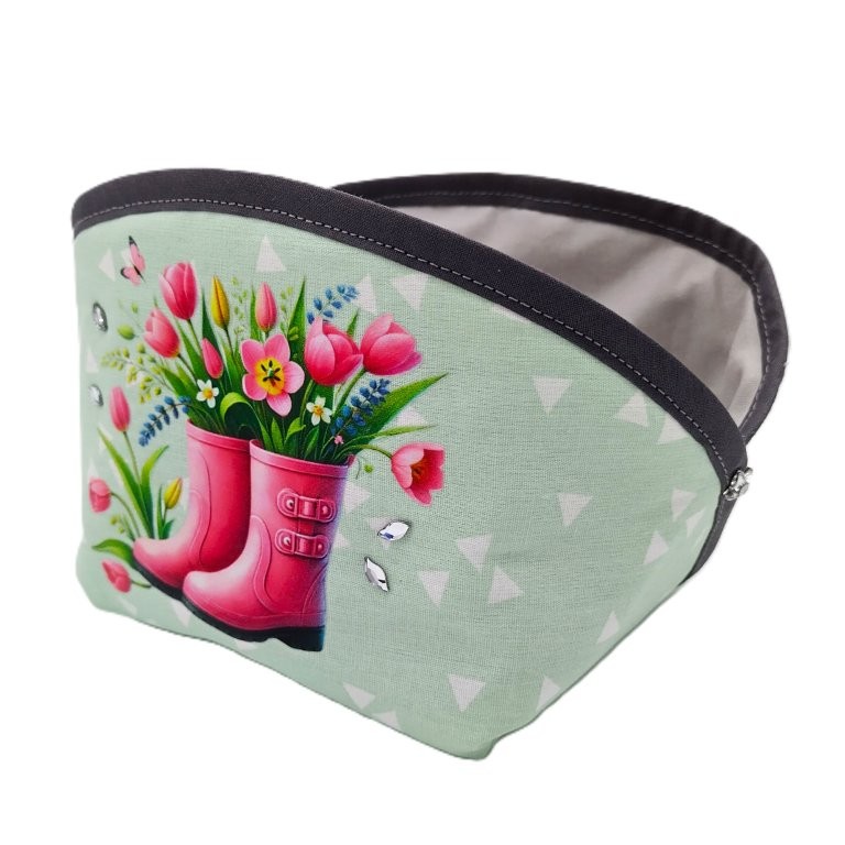 Zum besonderen Hingucker wird das Körbchen dank dem dunkelgrauen Zierrand, dem frühlingshaften Gartenmotiv mit Gummistiefeln, Blumen und Schmetterling und aufgesetzten hochwertigen Marken-Glitzersteinen in Form von Blättern auf der Vorderseite.