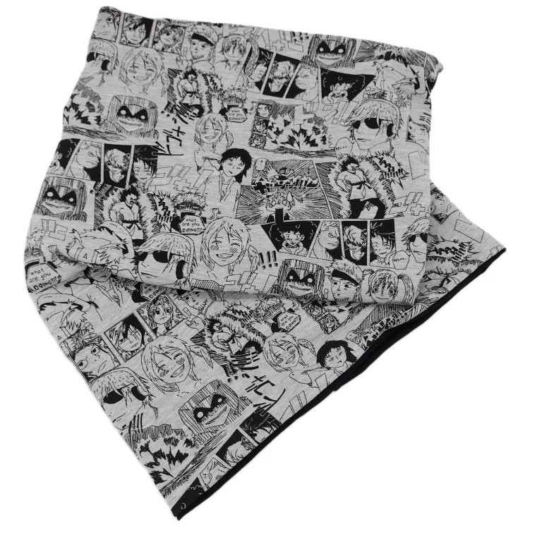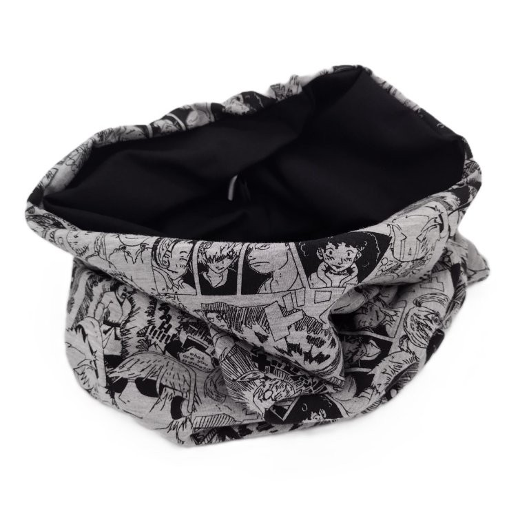 Bei dieser Halssocke wurde ein grau melierter Stoff mit Manga-Druck kombiniert mit uni schwarzem Jersey im Inneren.