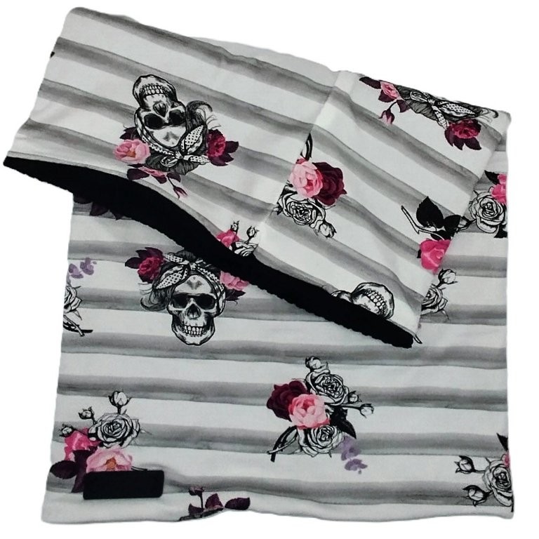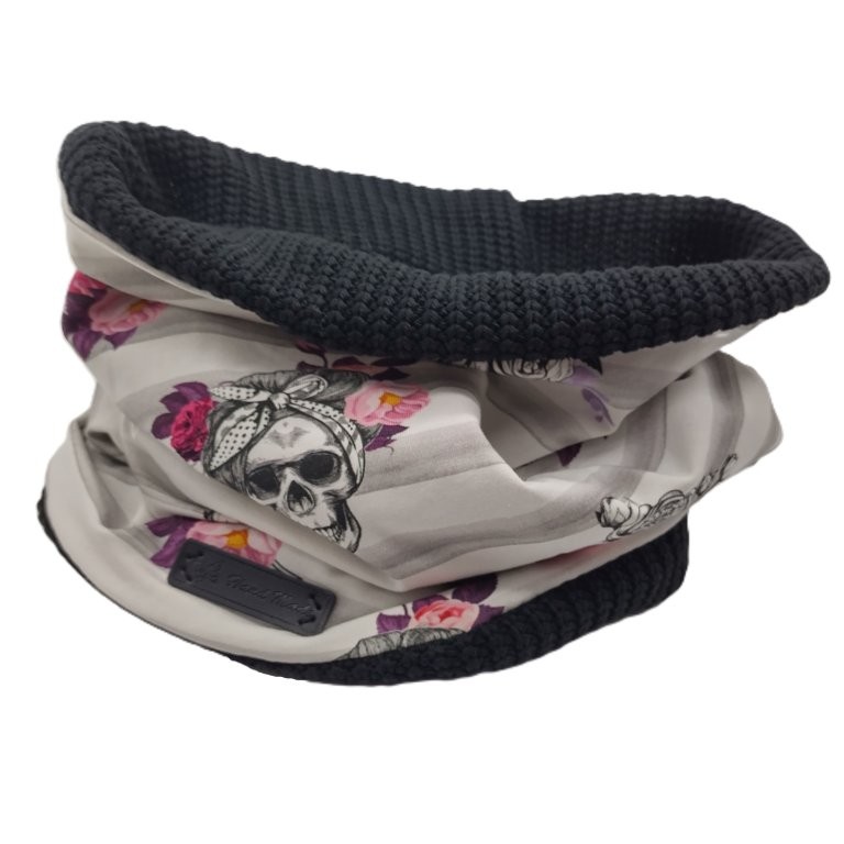 Bei dieser Halssocke wurde eine wunscherschöne Jersey-Eigenproduktion von Glitzerpüppi mit schwarzem Strickstoff kombiniert.