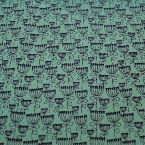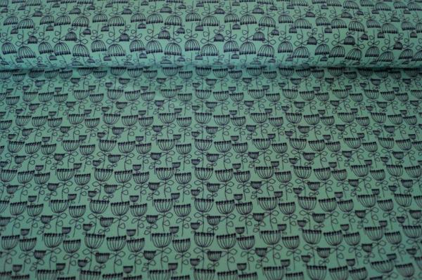 Blaue stilisierte Blümchen auf mintfarbenem Grund.