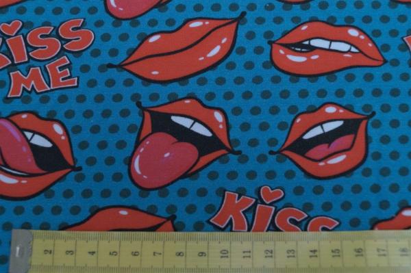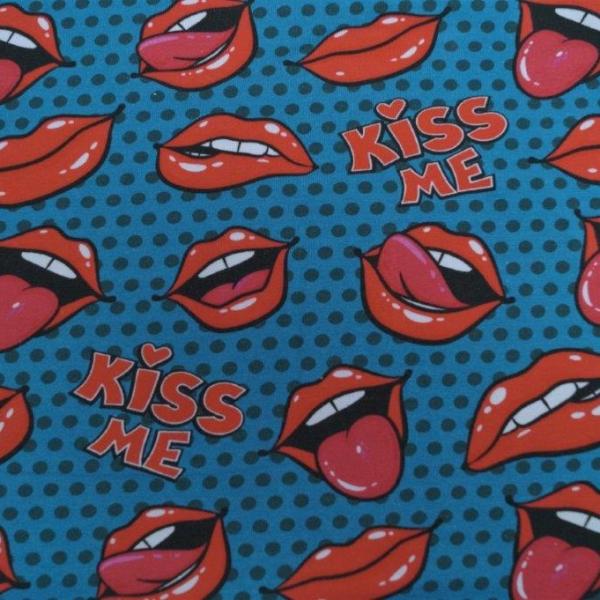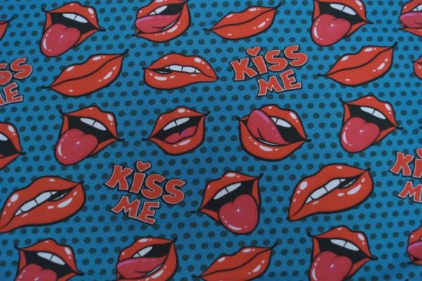 Jersey mit frechen Mündern und dem Text "Kiss me" Die volle Breite liegt bei 145 cm.