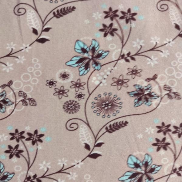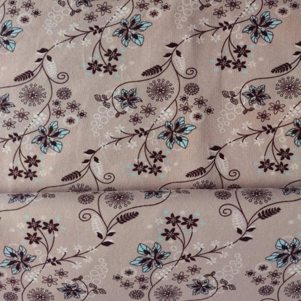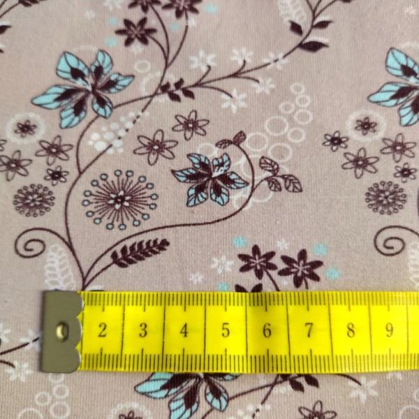 Jersey Meterware Blümchen mit hellblauen Akzenten auf beigefarbenem Grund.