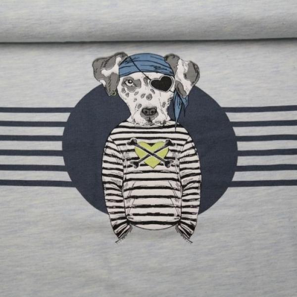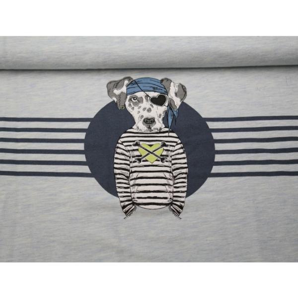 Panel zum Nähen von Shirts. Das Panel hat eine Höhe von 60 cm. Die volle Breite liegt bei 150 cm. Der Hund in der Mitte ist 20 cm hoch. Er ist auf beide Seiten der vollen Breite aufgedruckt, das Motiv ist also zwei Mal pro Panel vorhanden.