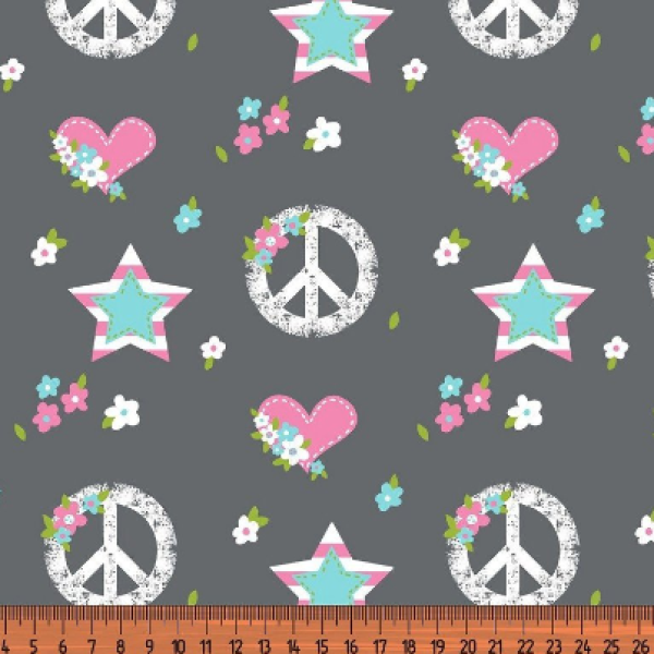 Peace-Zeichen, Herzen, Sterne und Blumen auf grauem Grund.