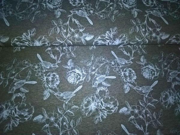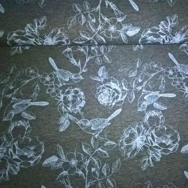 Hellblaue Vögel und Blumenzweige auf grau meliertem Grund