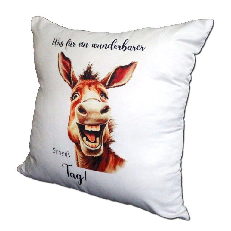 Der weiße Kissenbezug besteht aus einem weichen, glatten Polyester-Stoff. Er wurde bedruckt mit einem lustigen Motiv und Text ("Was für ein wunderbarer Scheiß-Tag!").