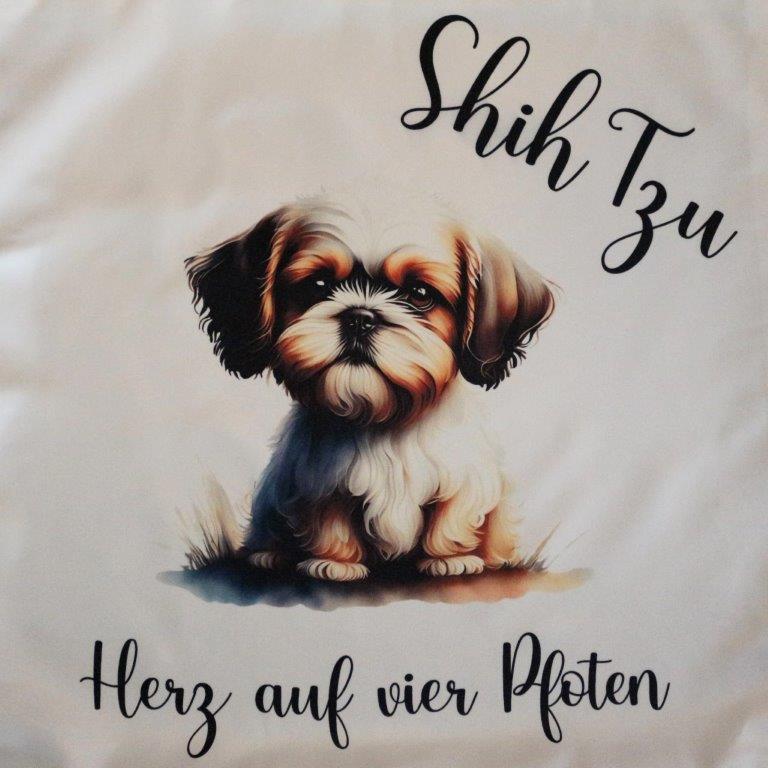 Der weiße Kissenbezug besteht aus einem weichen, glatten Polyester-Stoff. Er wurde bedruckt mit dem Bild eines süßen Shih Tzu und dem Text "Herz auf vier Pfoten".