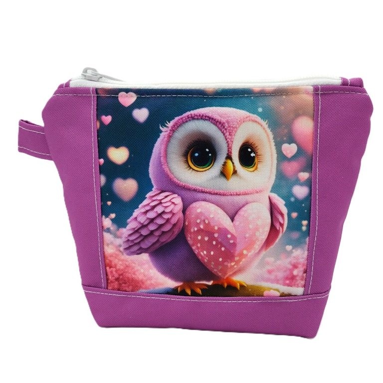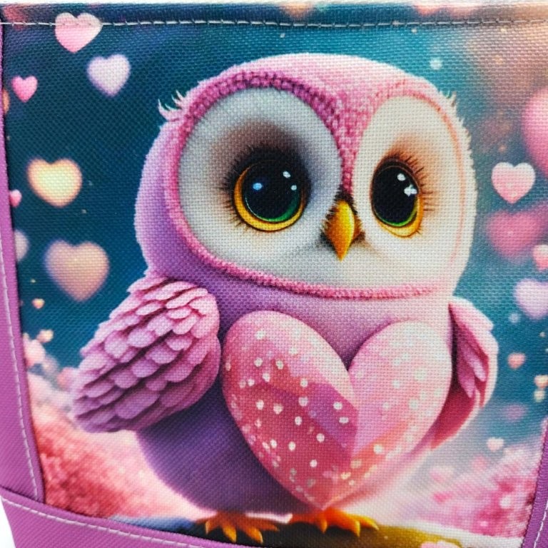 Die Vorderseite ist unterteilt in das Hauptmotiv mit einer süßen Eule. Umrahmt wird das Motiv von lila Uni-Stoff. Im Inneren wurde bunter Musterstoff vernäht.