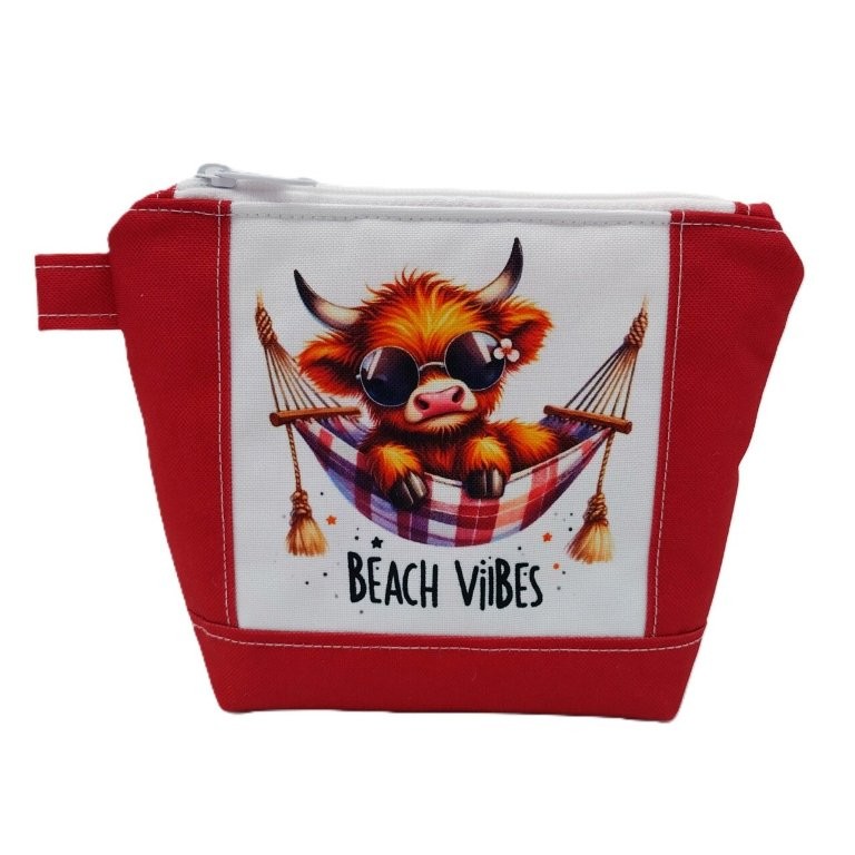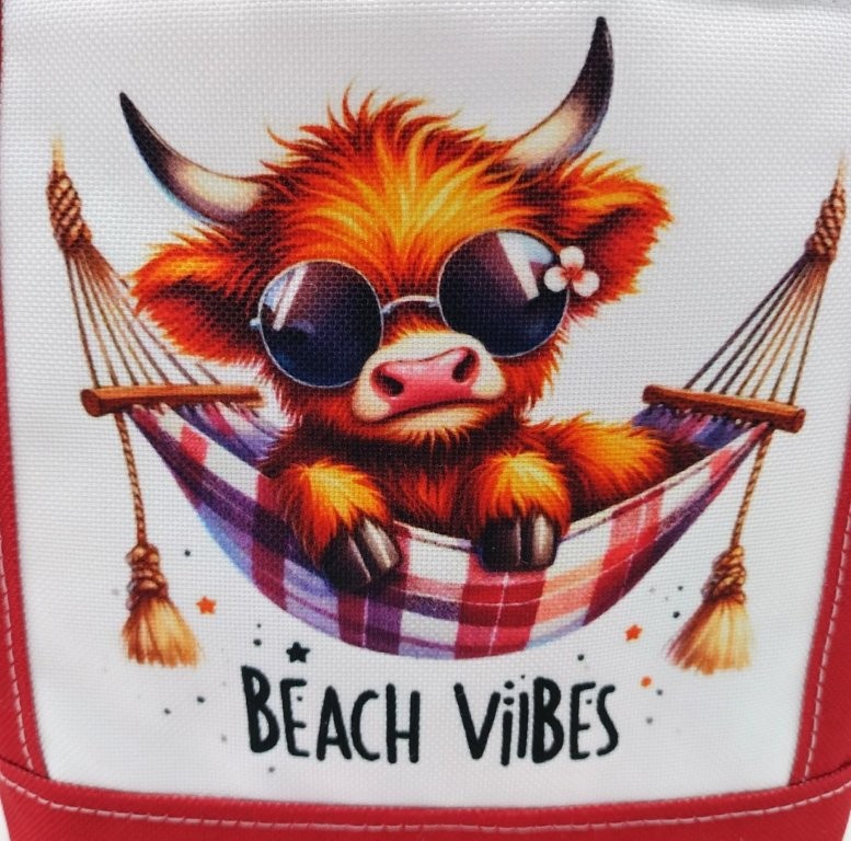 Die Vorderseite ist unterteilt in das Hauptmotiv mit einer süßen Highland Kuh in einer Hängematte und unifarbenem roten Stoff, der das Motiv umrahmt. Auf der Rückseite wurde ebenfalls der rote Stoff vernäht.
