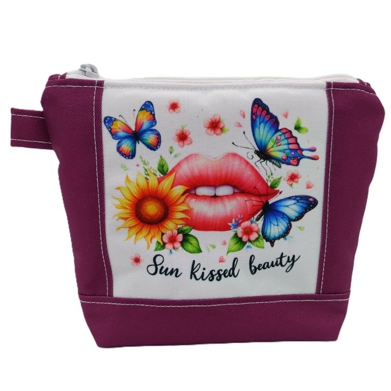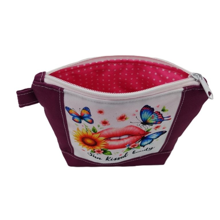 Die Vorderseite ist unterteilt in das Hauptmotiv mit Blumen, Schmetterlingen und einem Kussmund. Umrahmt wird das Motiv von lilafarbenem Uni-Stoff. Im Inneren wurde pinkfarbener Stoff mit weißen Pünktchen vernäht.