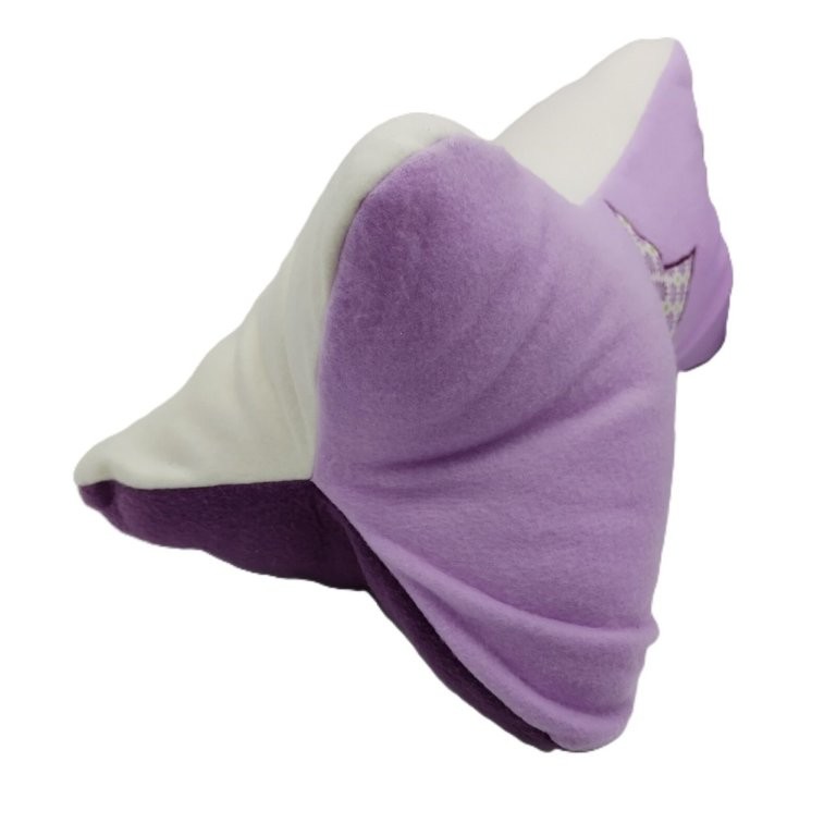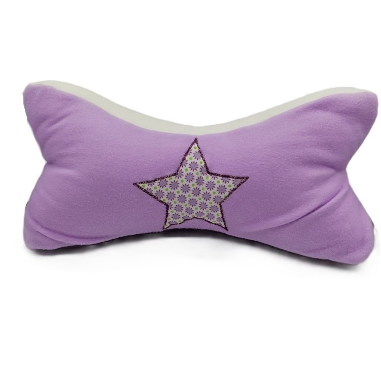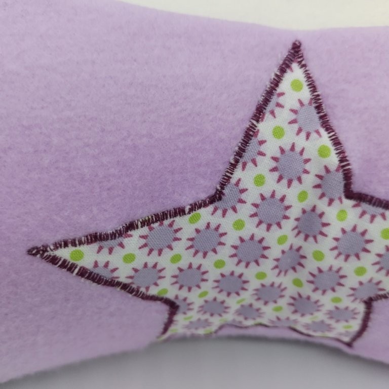 Der Bezug wurde aus kuscheligem Fleece-Stoff in Offwhite, Flieder und Lila vernäht. Außerdem wurde ein Stern aus gemustertem Baumwollstoff appliziert.