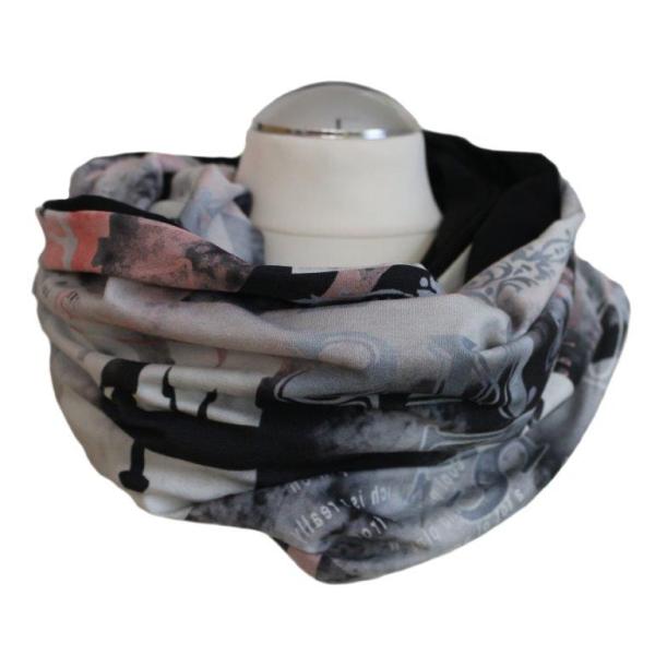 Loopschal mit Schriftzug-Druck rund ums Thema Fashion. Die Grautöne harmonieren toll mit dem zart gesetzten Rosé des hellen Stoffes. Kombiniert wurde er mit uni-schwarzem Stoff. So lässt sich das Design immer wieder anders drapieren. Der Schal wird doppelt um den Hals geschlungen und sorgt so für einen Zwiebel-Effekt, der die Wärme am Körper hält.