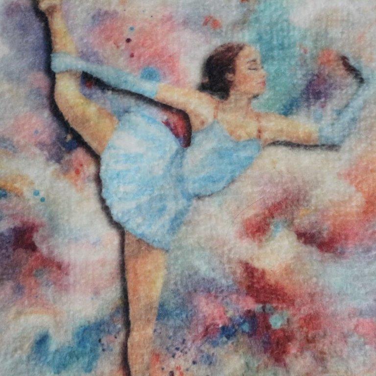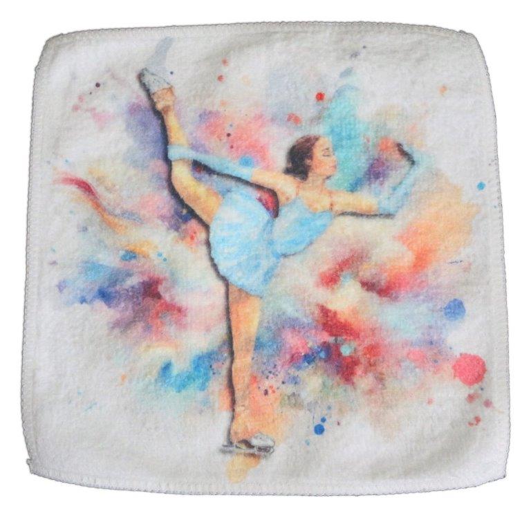 Bedruckt ist das Tuch mit einer Eisläuferin in blauem Kleid. Die Rückseite ist weiß.