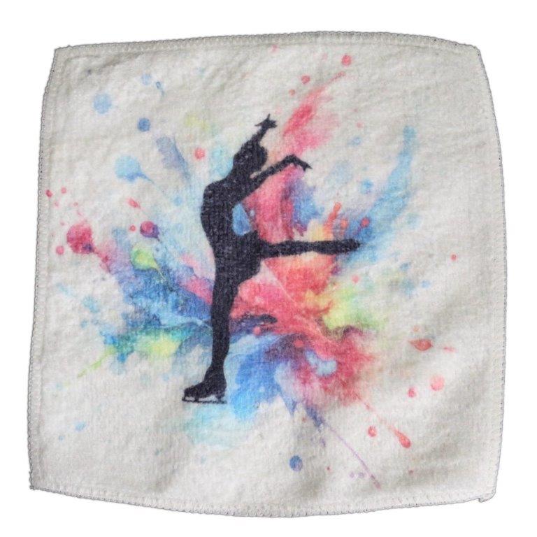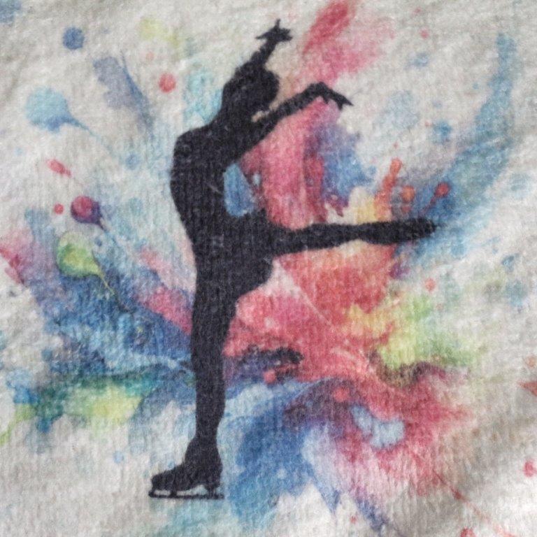 Bedruckt ist das Tuch mit einer Eisläuferin auf buntem Hintergrund, die Farben sind etwas zurückgenommen. Die Rückseite ist weiß.