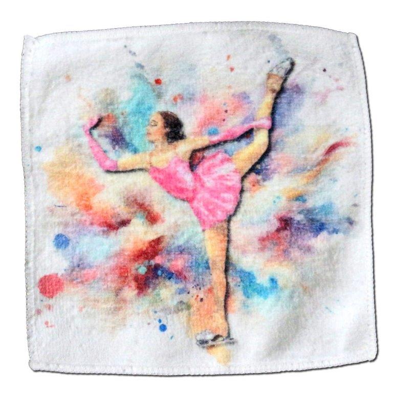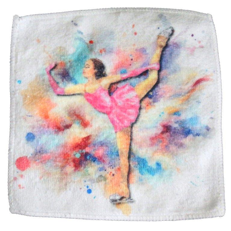 Bedruckt ist das Tuch mit einer Eisläuferin in pinkem Kleid. Die Rückseite ist weiß.