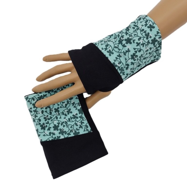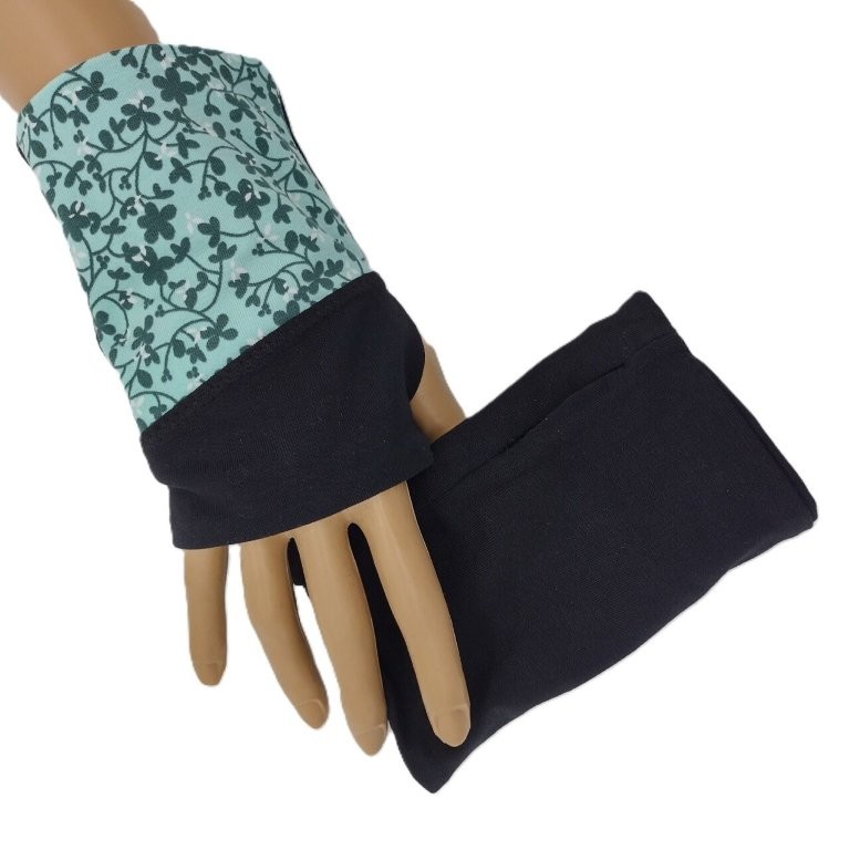 Diese Handstulpen / Pulswärmer mit Daumenloch wurden aus grünem Blümchen-Stoff und schwarzem Uni-Stoff genäht. Innen sind die Pulswärmer schlicht schwarz.