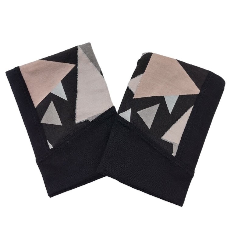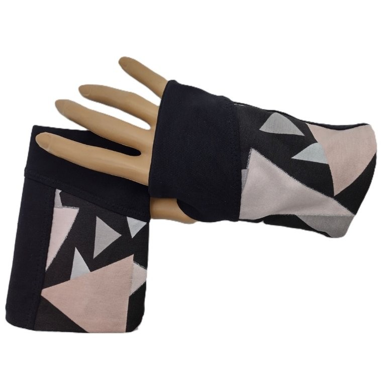 Diese Handstulpen / Pulswärmer mit Daumenloch wurden aus schwarz-rosa Musterstoff und schwarzem Uni-Stoff genäht. Innen sind die Pulswärmer schlicht schwarz.