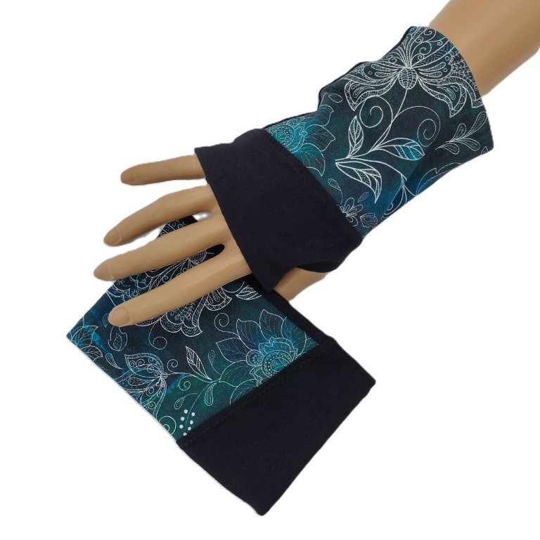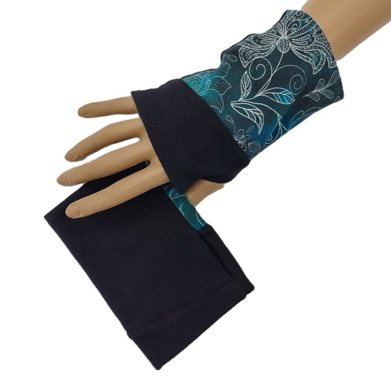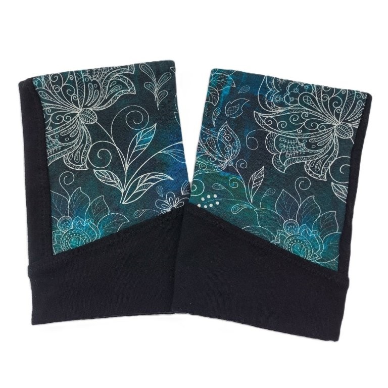 Diese Handstulpen / Pulswärmer mit Daumenloch wurden aus edel gemustertem Stoff und schwarzem Uni-Stoff genäht. Innen sind die Pulswärmer schlicht schwarz.