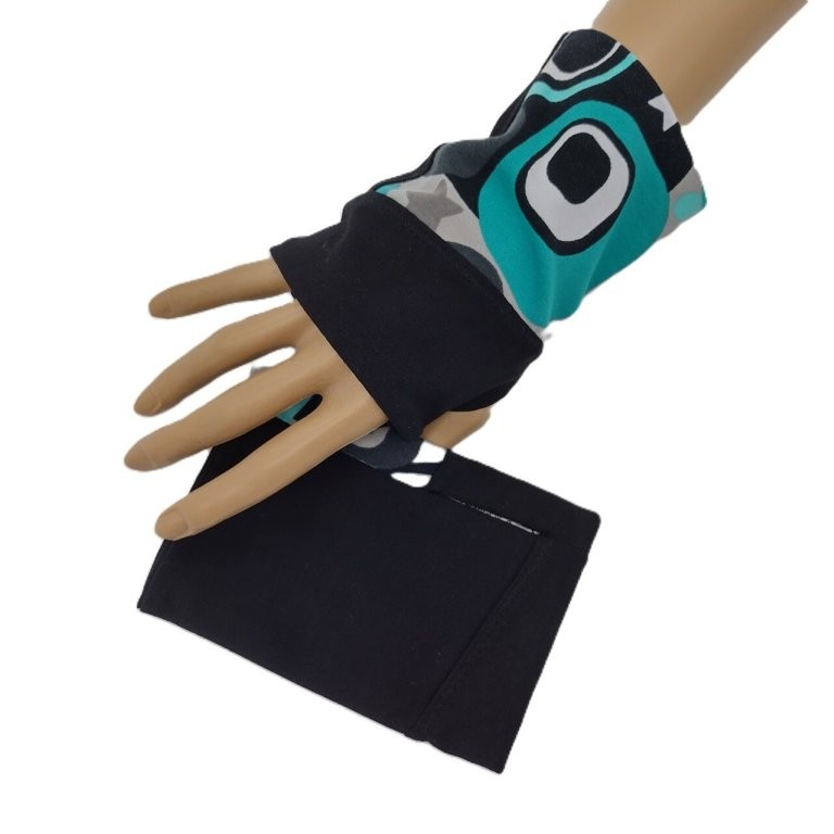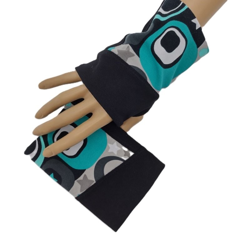 Diese Handstulpen / Pulswärmer mit Daumenloch wurden aus grafisch gemustertem Stoff und schwarzem Uni-Stoff genäht. Innen sind die Pulswärmer schlicht schwarz.