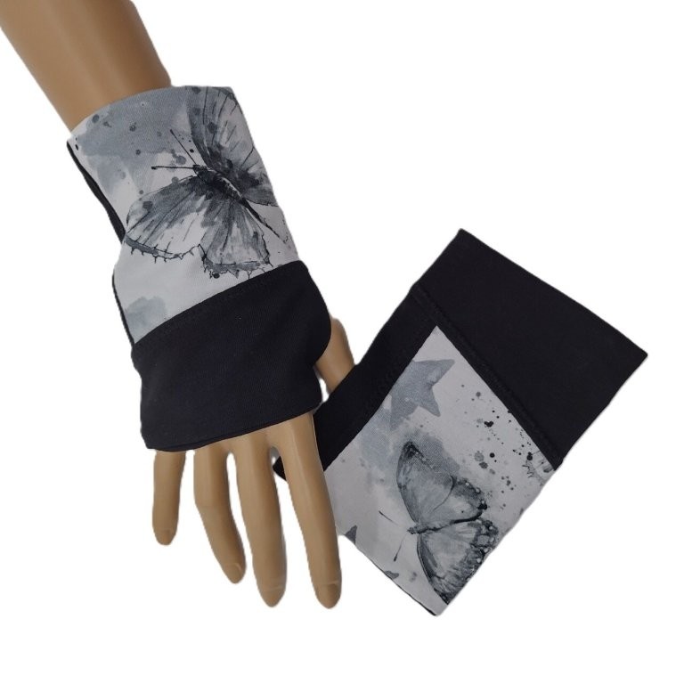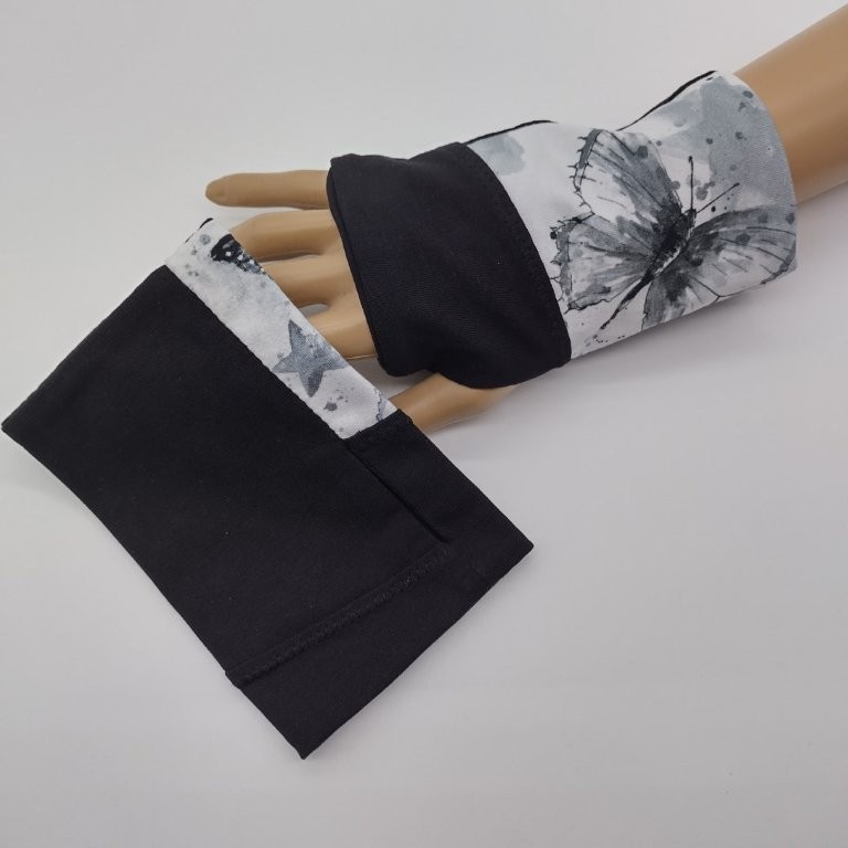 Diese Handstulpen / Pulswärmer mit Daumenloch wurden aus weißem Musterstoff und schwarzem Uni-Stoff genäht. Innen sind die Pulswärmer schlicht schwarz.