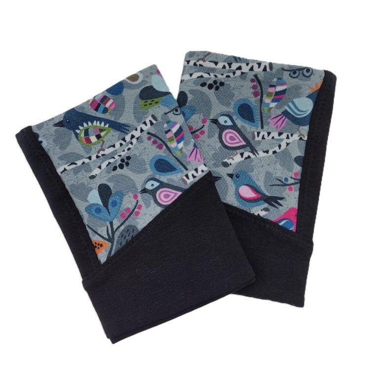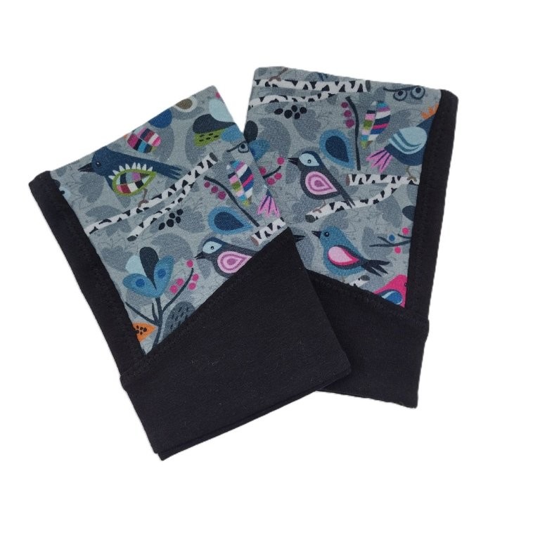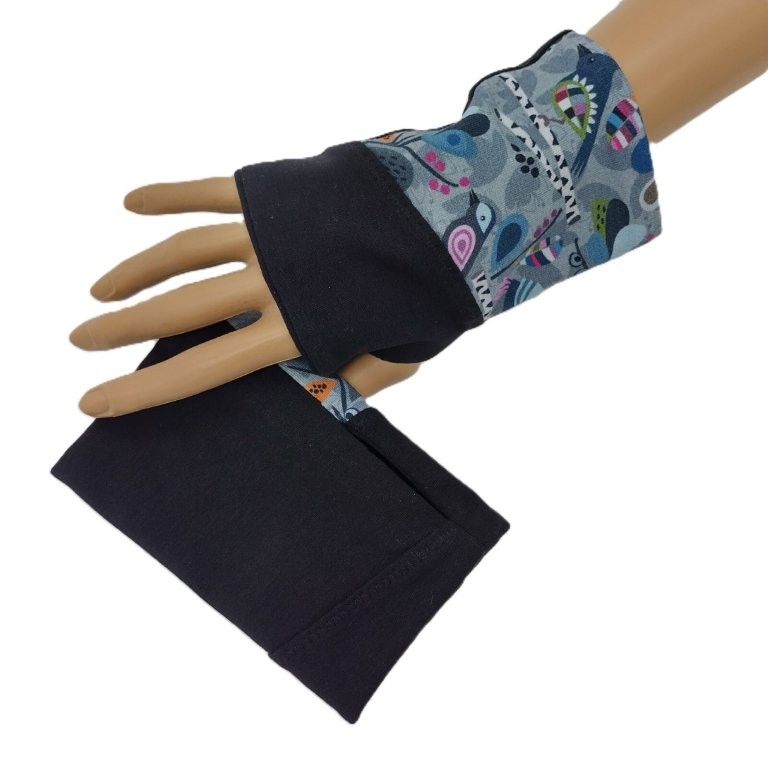 Diese Handstulpen / Pulswärmer mit Daumenloch wurden aus gemustertem Stoff und schwarzem Uni-Stoff genäht. Innen sind die Pulswärmer schlicht schwarz.