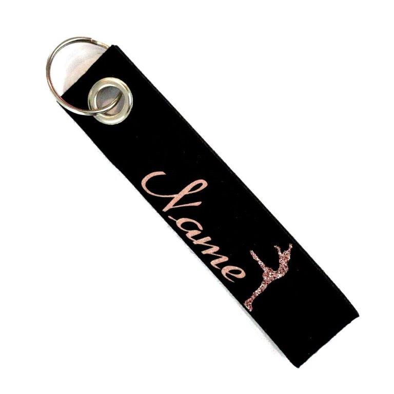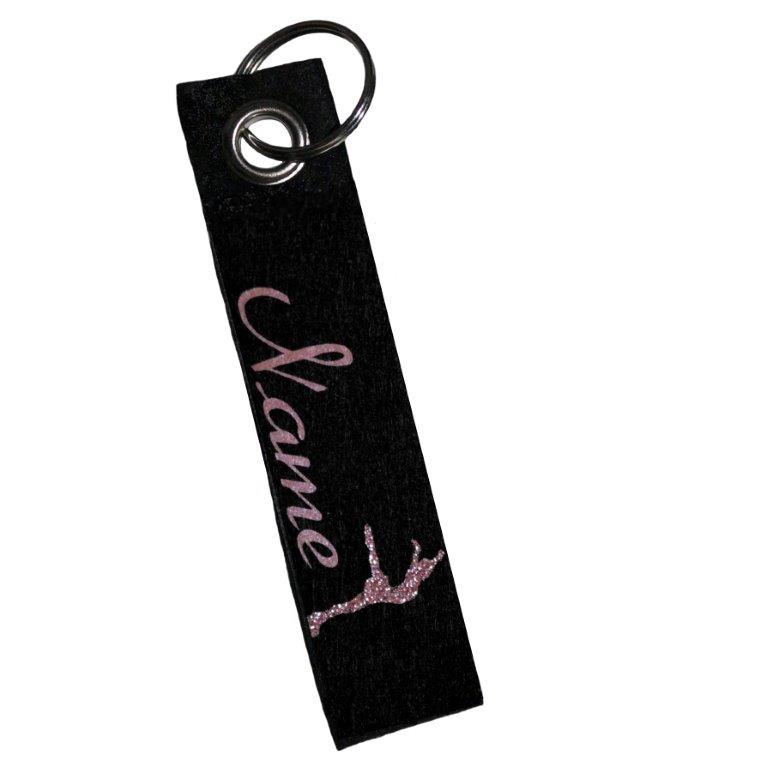 Schlüsselanhänger aus schwarzem Filz, bedruckt mit einer Eisläuferin und Namen in altrosé und rosa Glitzer.