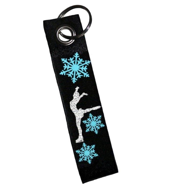 Schlüsselanhänger aus schwarzem Filz, bedruckt mit einem Eiskunstlauf-Motiv in türkis und silber Glitzer.