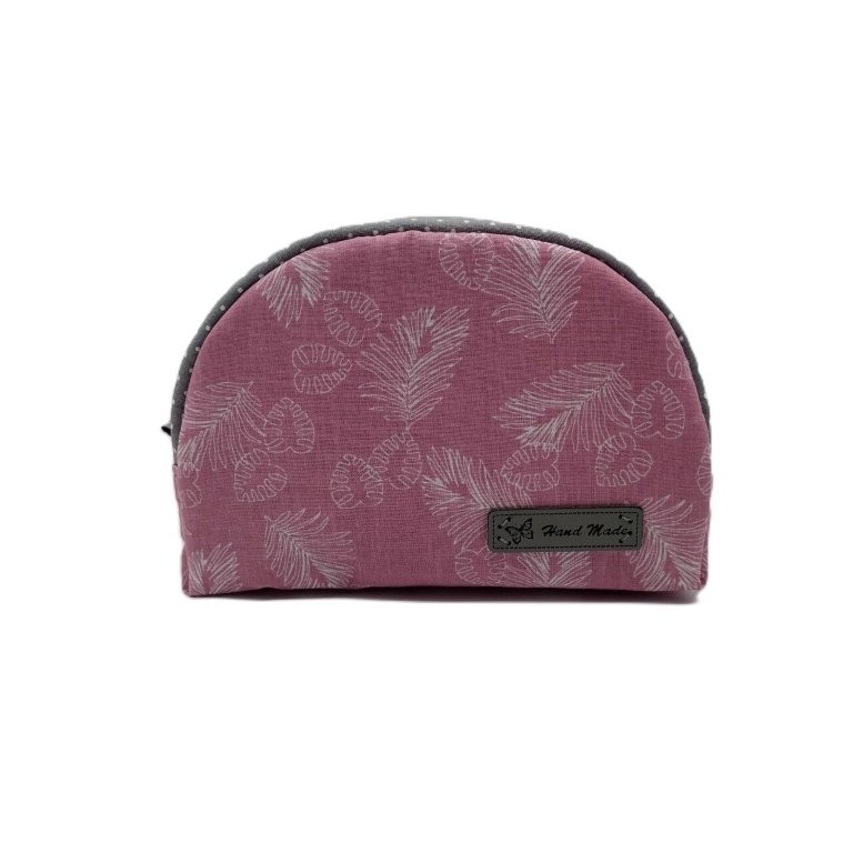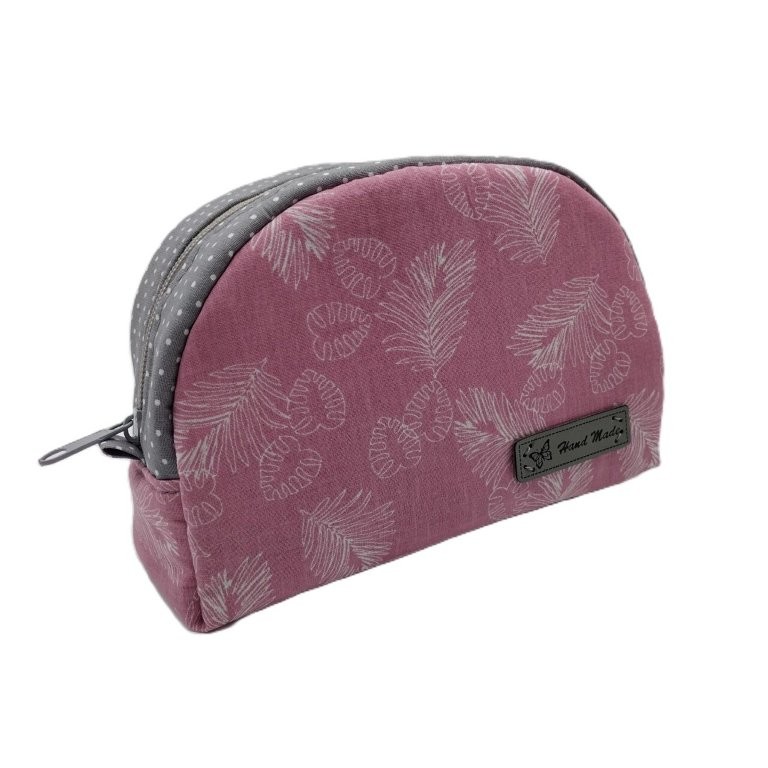 Dieses Täschchen wurde aus Blätterstoff in gesetztem Rosa und grauem Punkte-Stoff genäht. Innen wurde ebenfalls der graue Stoff verwendet.