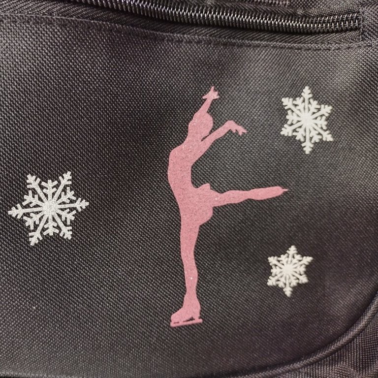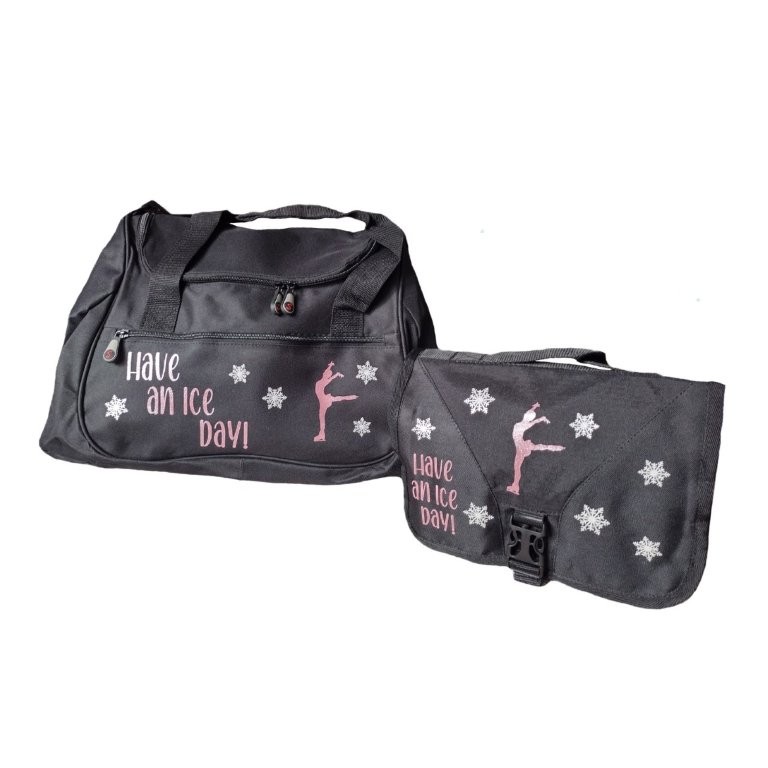Set aus Sporttasche und Kulturtasche mit Druck einer Eisläuferin, Schneeflocken und dem Text "HAVE AN ICE DAY!" in rosa Glitzer und weiß Glitzer.