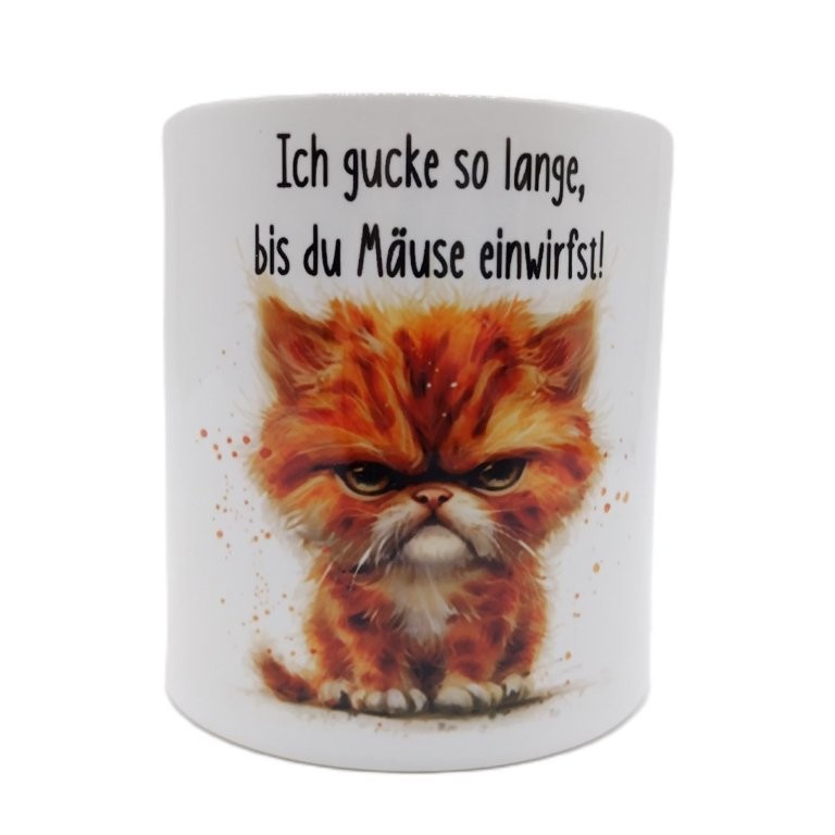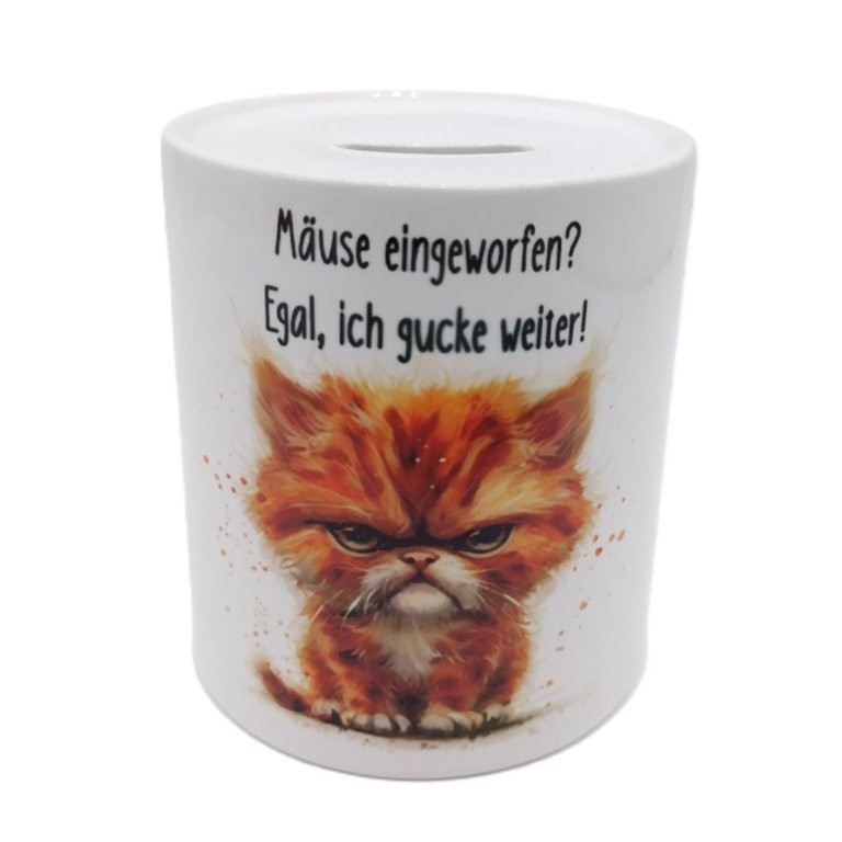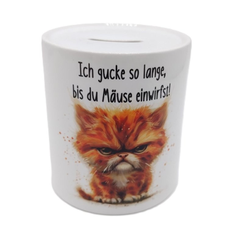 Auf der einen Seite sieht man eine grummelig schauende Katze und den Spruch "Ich gucke so lange, bis du Mäuse einwirfst!". Dreht man die Spardose um, erscheint die gleiche Katze mit dem Text "Mäuse eingeworfen? Egal, ich gucke weiter!" So kann man sich zum Beispiel auf eine lustige Art für erhaltenes Trinkgeld bedanken und gleichzeitig für einen Lacher sorgen.