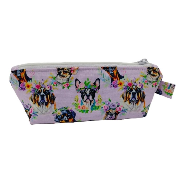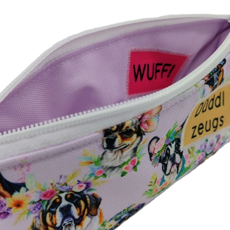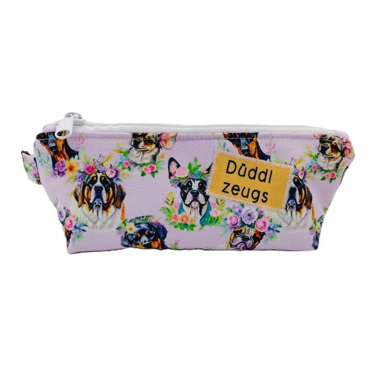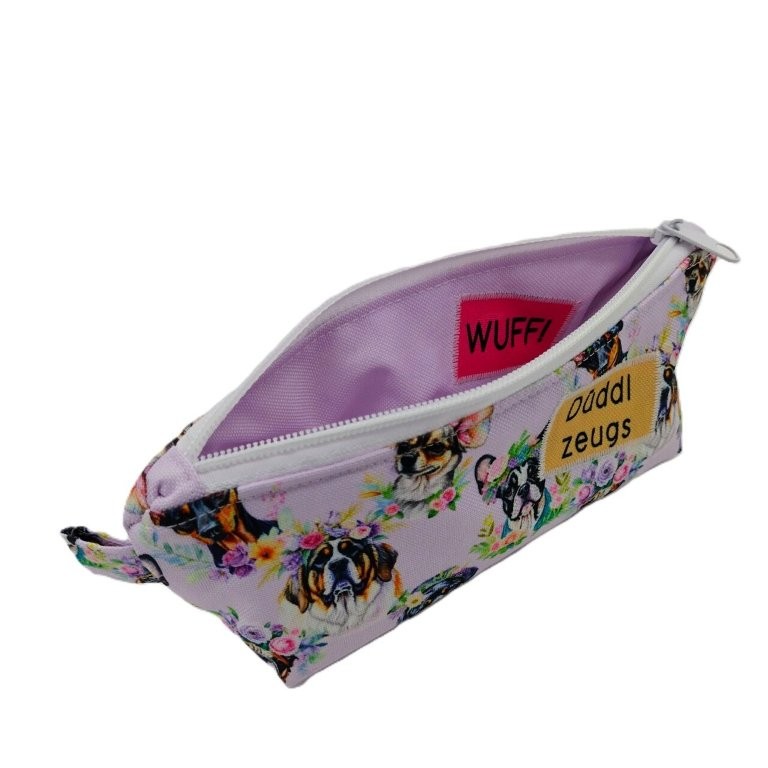 Der fliederfarbene Stoff ist bedruckt mit Hunden und Blumen. Ein Patch zeigt auf der einen Seite den Text "Düddlezeugs". Innen wurde ebenfalls fliederfarbener Stoff verwendet. Hier findet sich ein zweiter Patch mit dem Text "Wuff".