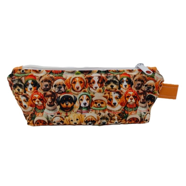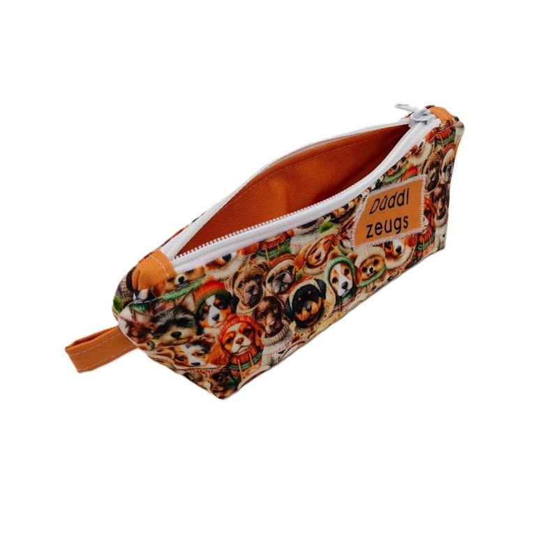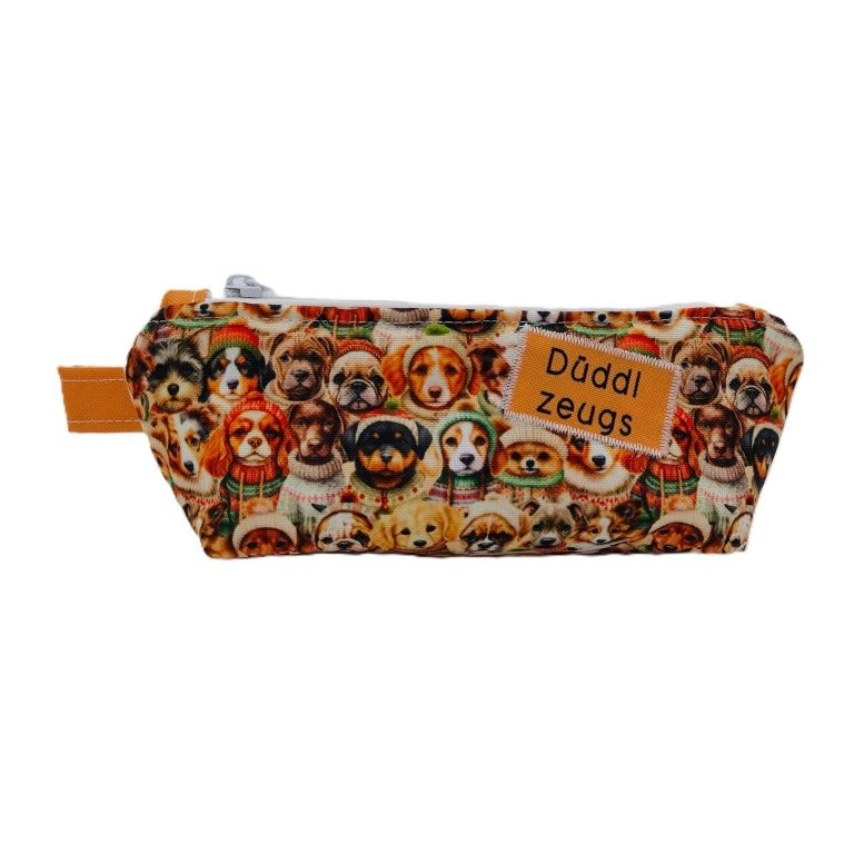 Der Stoff ist bedruckt mit Hunden, die Mützen und Strickpullover tragen. Ein Patch zeigt den Text "Düddlzeugs". Innen wurde hell orangefarbener Stoff verwendet. Die Stoffe sind wasserabweisend, so dass die Tasche bei Bedarf einfach nur mit einem feuchten Tuch ausgewischt werden muss.