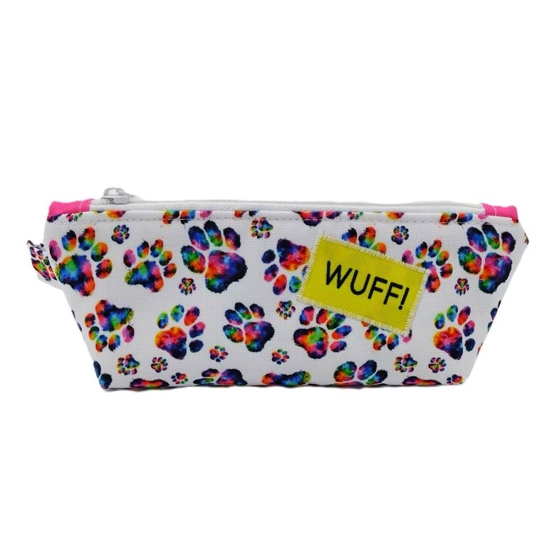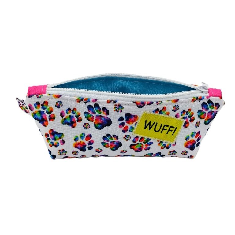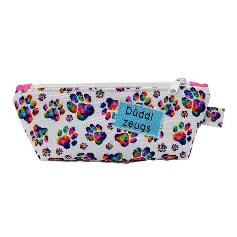 Der Stoff ist bedruckt mit bunten Pfotenabdrücken. Aufgenähte Patches zeigen auf der einen Seite den Text "Wuff" und auf der anderen "Düddlzeugs". Innen wurde hellblauer Stoff verwendet. Die Stoffe sind wasserabweisend, so dass die Tasche bei Bedarf einfach nur mit einem feuchten Tuch ausgewischt werden muss.