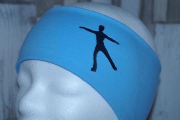 Dieses Stirnband ist ein absoluter Hingucker und hält die Ohren schön warm. Es wird aus zwei Lagen hellblauem Jersey genäht und mit einem Eiskunstläufer in schwarz veredelt.