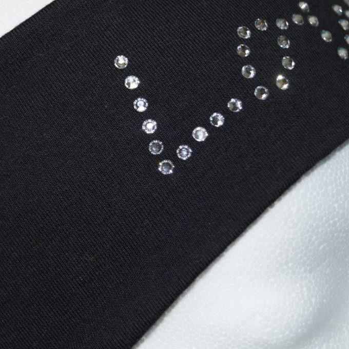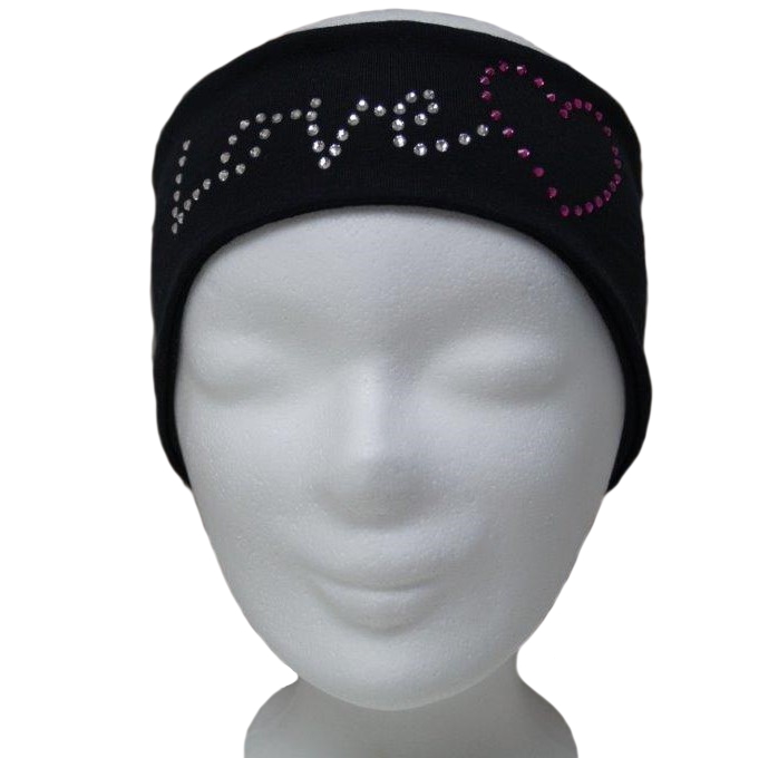 Dieses Stirnband ist ein absoluter Hingucker und hält die Ohren schön warm. Es wird aus zwei Lagen schwarzem Stoff genäht, Glitzersteine eines namhaften Markenherstellers bilden das Wort "Love" und ein Herz.