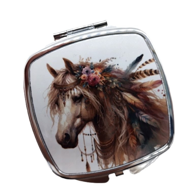 Es zeigt ein mit Federn geschmücktes Pferd im Boho-Stil