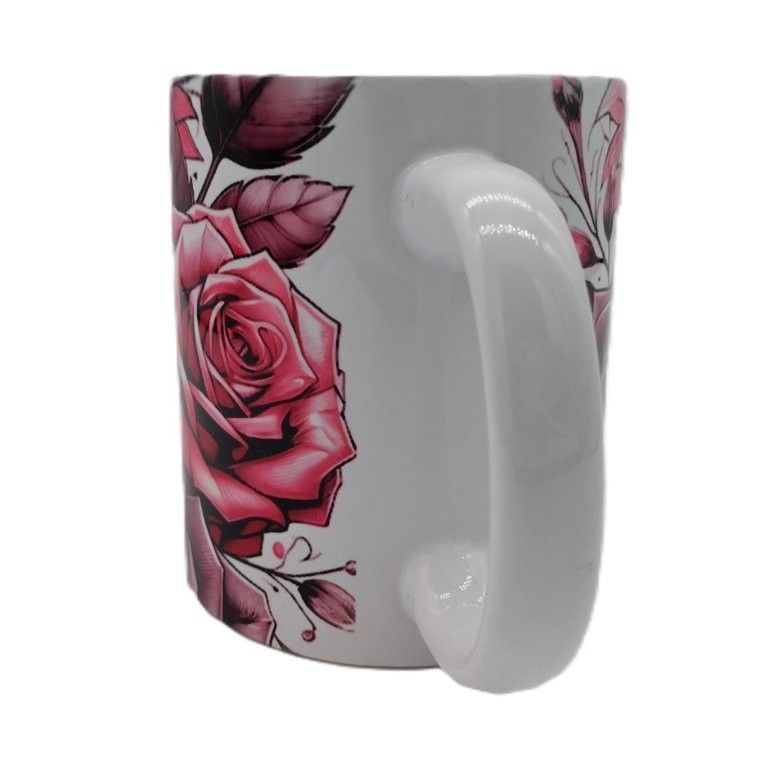 Diese Tasse wurde von uns in liebevoller Handarbeit mit einem Totenkopf- und Blumenmotiv im Tattoo-Stil bedruckt.