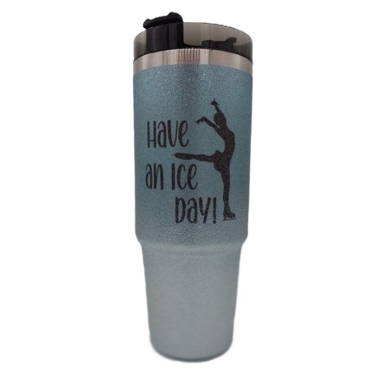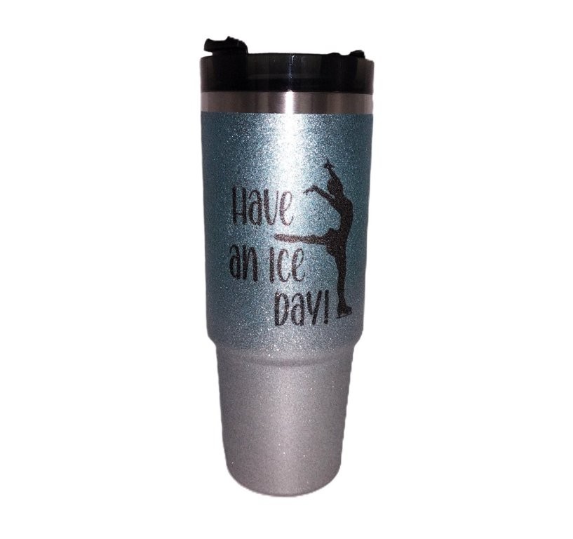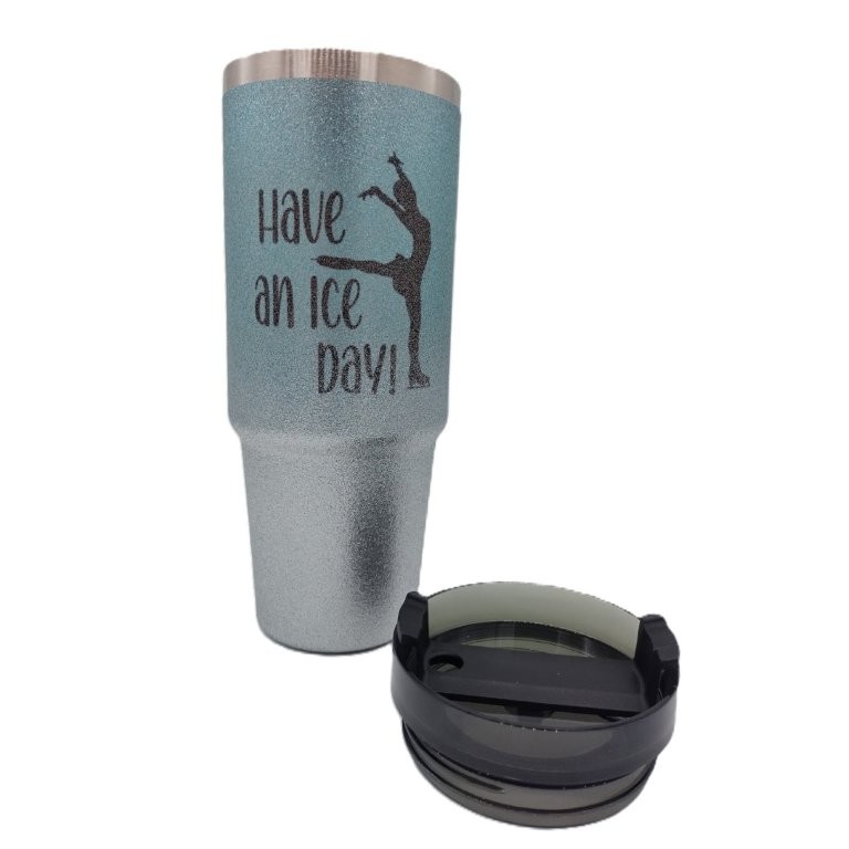 Die glitzernde Pulverbeschichtung zeigt einen Verlauf von silber zu blau. Aufgedruckt wurde eine Eisläuferin und der Text "have an ice day!" in schwarz.