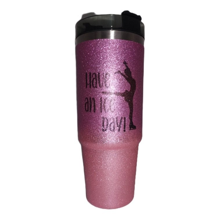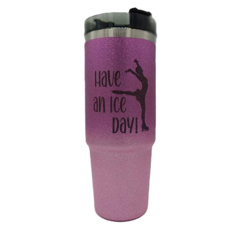Die glitzernde Pulverbeschichtung zeigt einen Verlauf von lila zu pink. Aufgedruckt wurde eine Eisläuferin und der Text "have an ice day!" in schwarz.