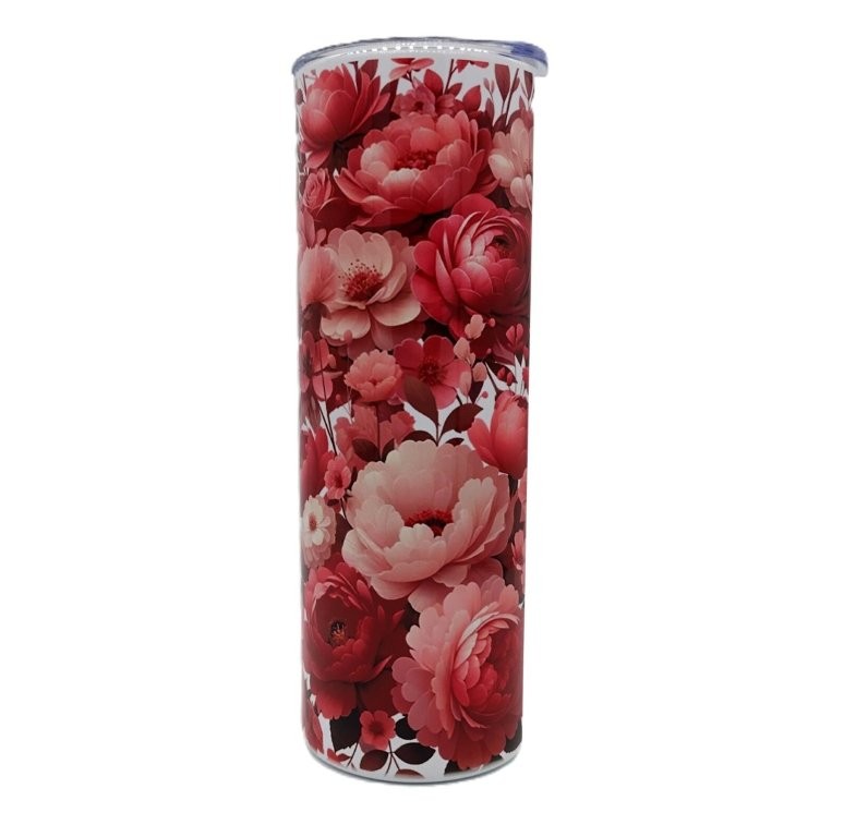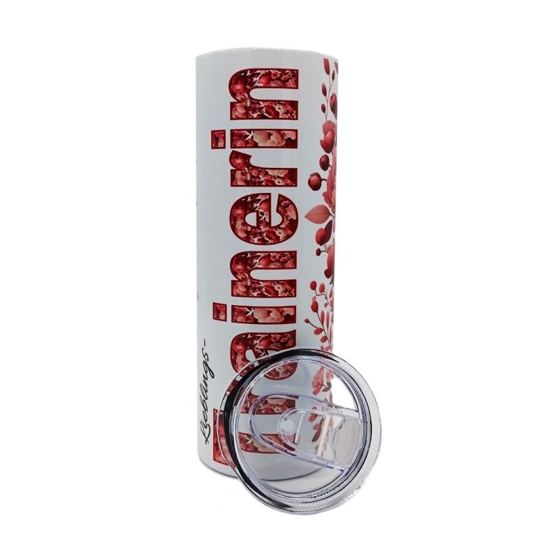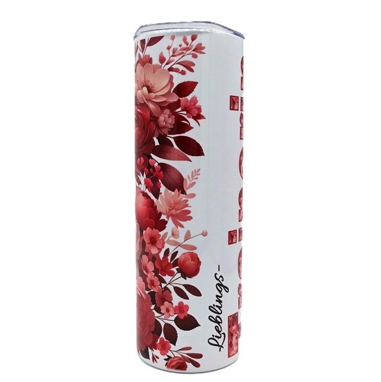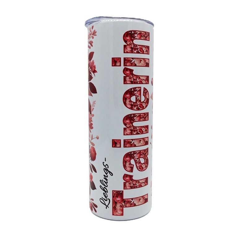 Dieser Trinkbecher aus doppelwandigem Edelstahl wurde von uns individuell bedruckt mit einem Blumenmotiv. Der Schriftzug "Trainerin" ist in dicken Buchstaben, die ebenfalls mit dem Blumenmotiv gefüllt sind, gedruckt. In schwarz wurde vor dieses Wort "Lieblings-" gestellt.