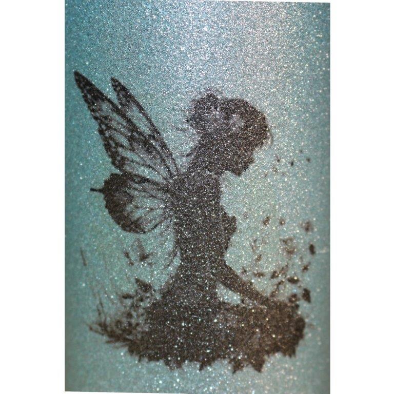 Wunderschöne Trinkflasche aus Edelstahl, pulverbeschichtet mit blauem Glitzer, von uns bedruckt mit einem Feenmotiv.