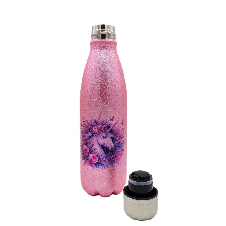 Wunderschöne Trinkflasche aus Edelstahl, pulverbeschichtet mit rosa Glitzer, von uns bedruckt mit einem Einhorn.