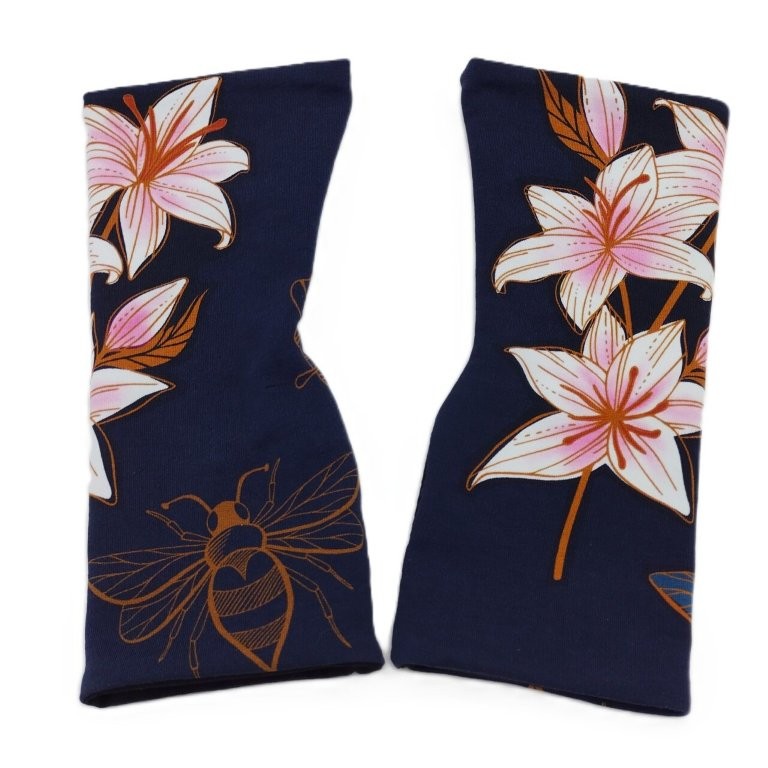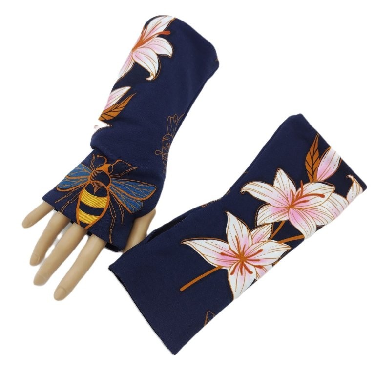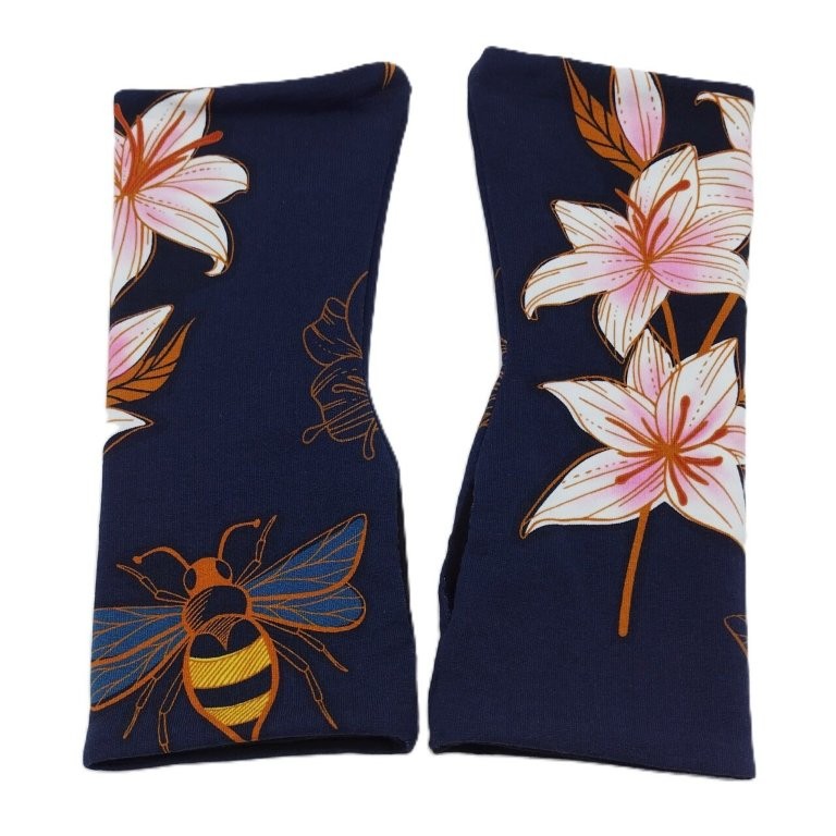 Bei diesen Armstulpen wurde French Terry mit tollem Blumen- und Bienendruck mit weichem, uni schwarzen Jersey kombiniert.