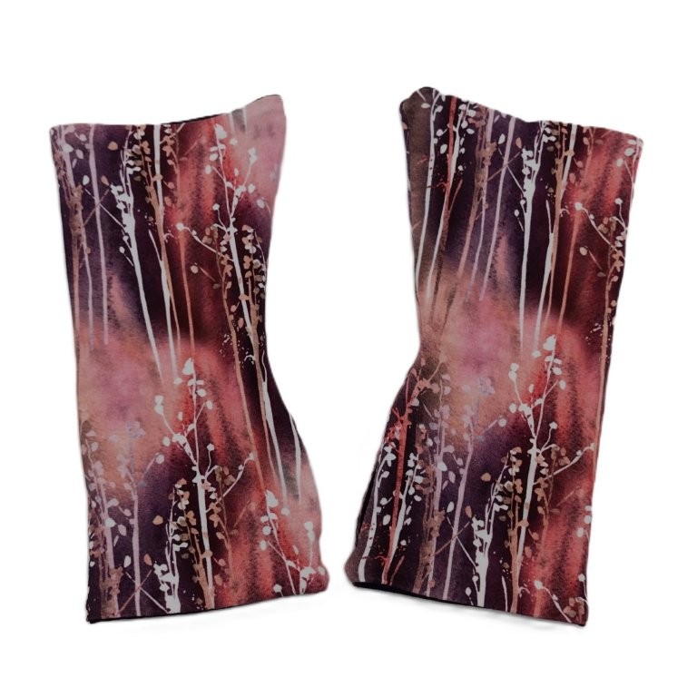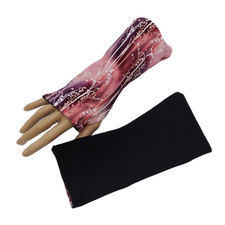 Das weiße Muster setzt sich bei diesen Armstulpen toll von den Farbverläufen in verschiedenen Rot-Tönen ab. Kombiniert wurde der tolle Musterstoff mit uni schwarzem Jersey.
